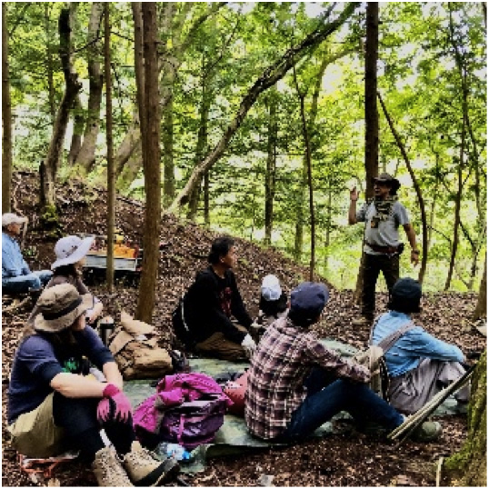 ●現地の丸太を利用した100畳のウッドデッキ里山に生育する小動物の観察会やムササビの巣箱作りの様子