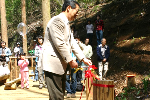 ●「ロハス村」の取り組みをきっかけに大月市の観光の活性化と森林を活用した“癒しの街”にしたいと大月市長による挨拶とテープカットが行われました。