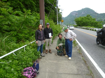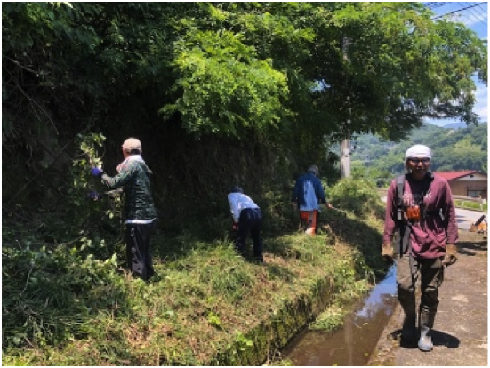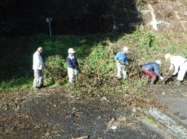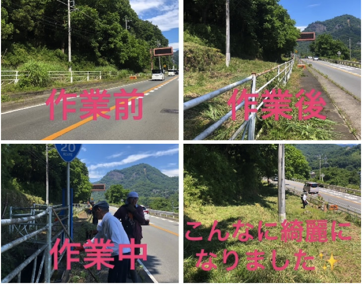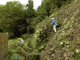 地元の林業家の指導の下、土手や国道20号沿いの繁生する山林、山道の下草刈りを行いました。